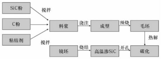 以反應燒結碳化硅為例,其工藝過程是將碳源和碳化硅粉混合,通過注漿成型,干壓或冷等靜壓成型制備出坯體,然后進行滲硅反應,即在真空或惰性氣氛下將坯體加熱至1500℃以上,固態硅熔融成液態硅,通過毛細管作用滲入含氣孔的坯體。液態硅或硅蒸氣與坯體中C之間發生化學反應,原位生成的β-SiC與坯體中原有SiC顆粒結合,形成反應燒結碳化硅陶瓷材料。工藝流程圖如下:
