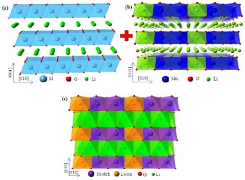 富鋰錳基層狀正極材料 xLi2MnO3·(1-x)LiMO2 (M = Ni, Co, Mn)的結構示意圖