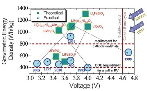 無論是傳統的層狀正極材料、立方尖晶石正極材料,還是聚陰離子磷酸鹽正極材料,它們的實際可逆比容量都未能超過250mAh/g,難以滿足動力鋰離子電池對高比容量正極材料的需求,不同正極材料的理論和實際能量密度下圖所示。富鋰層狀正極材料起源于傳統層狀材料,由于其在電化學活化后,可逆比容量超過250mAh/g,因此吸引了國內外科學家廣泛的研究興趣。
