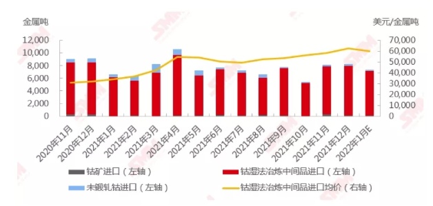 12月鈷中間品進口量小幅上漲,主要原因是受海外物流的貨物陸續(xù)到港影響。