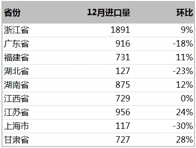 鈷中間品進口情況分地區(qū)來看,12月廣東省、湖北省、上海市等地進口量環(huán)比下滑;浙江省、江蘇省、湖南省、甘肅省等地的進口量環(huán)比增多。