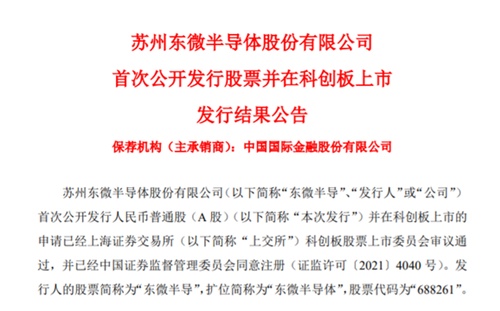 中國粉體網訊 蘇州東微半導體股份有限公司日前發布了首次公開發行股票并在科創板上市發行結果公告,其股票簡稱為東微半導,股票代碼為688261,這也意味著,東微半導即將在上交所科創板上市。