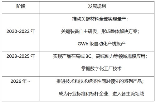 2023-2025年計劃實現(xiàn)產(chǎn)品在高端3C、高端動力等領(lǐng)域規(guī)模應(yīng)用;掌握數(shù)字化工廠技術(shù)。2026年以后推進(jìn)技術(shù)和技術(shù)經(jīng)濟性同時領(lǐng)先的系列產(chǎn)品;成為行業(yè)標(biāo)準(zhǔn)和標(biāo)桿企業(yè),進(jìn)入各主流領(lǐng)域。