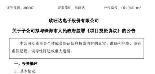 截至本公告日,子公司欣旺達汽車電池擬與珠海市政府簽署《珠海市人民政府欣旺達電動汽車電池有限公司項目投資協議》(文中簡稱“《項目投資協議》”)。 該項目計劃總投入約120億元,其中固定資產投資總額約100億元,計劃建設總產能達30GWh的動力電池項目,從事動力電芯、電池模組和電池系統的研發、設計、 生產及銷售。