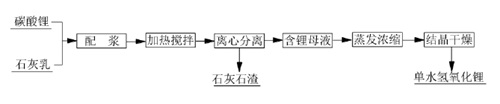 該法是以碳酸鋰與精制石灰乳為原料,按1:1.08的摩爾比進行配漿,調節苛化液濃度為18~20 g/L,控制苛化時間為30 min左右。由于碳酸鋰和石灰乳在水中溶解度均較小,反應過程需加熱至沸騰并強力攪拌,反應液經離心分離得到難溶的CaCO3沉淀和質量濃度約3.5%的LiOH溶液,濾液經蒸發濃縮、結晶干燥后制得單水氫氧化鋰產品。其工藝流程見圖。