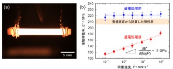 (a)樣品在通電處理過程中的外觀,(b)接觸彈性模量對負載速度的依賴性
