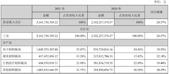 3月9日晚間,國瓷材料披露2021年年報,報告期內,公司共實現營業收入31.62億元,比上年同期增長24.37%。