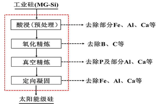 冶金法是指以工業硅為原料,采用濕法冶金、真空熔煉、氧化精煉、定向凝固、特種場熔煉等技術組合而制備太陽能級多晶硅的方法。冶金法的特點是在提純過程中硅不參與任何化學反應,依靠硅與雜質物理性質的差異,通過冶金熔煉的方法將雜質去除,從而獲得滿足太陽能電池性能需求的多晶硅,具有低成本、安全環保等優點,成為該領域的研究熱點。