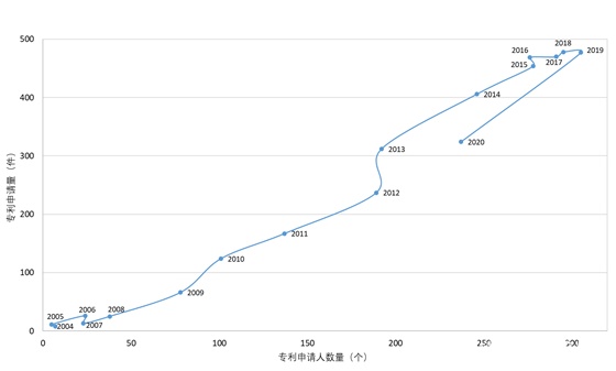 通過(guò)對(duì)石墨烯燃料電池領(lǐng)域?qū)@暾?qǐng)人的分析發(fā)現(xiàn):在美國(guó)、韓國(guó)、日本和歐洲,企業(yè)的研發(fā)水平和成果數(shù)量處于領(lǐng)先地位,美國(guó)和韓國(guó)的高校、歐洲的科研院所也擁有較多專利,且重要申請(qǐng)人均進(jìn)行了大量的海外布局,其中比較有代表性的包括:美國(guó)的麻省理工學(xué)院、萊斯大學(xué)和納米技術(shù)儀器公司,韓國(guó)的現(xiàn)代汽車公司、LG化學(xué)公司和三星電子公司,日本的松下電器產(chǎn)業(yè)公司、半導(dǎo)體能源研究所和豐田汽車公司,歐洲的原子能和替代能源委員會(huì)、法國(guó)國(guó)家科學(xué)研究中心和巴斯夫歐洲公司。與上述國(guó)家/地區(qū)相比,中國(guó)則是高校的研發(fā)水平和成果數(shù)量占據(jù)絕對(duì)優(yōu)勢(shì),重要申請(qǐng)人有中國(guó)科學(xué)院大連化學(xué)物理所(如圖2-3所示)、清華大學(xué)、成都新柯力化工科技有限公司等30位,但是基本沒(méi)有進(jìn)行海外布局,且專利申請(qǐng)質(zhì)量整體偏低,造成了技術(shù)價(jià)值的損失。