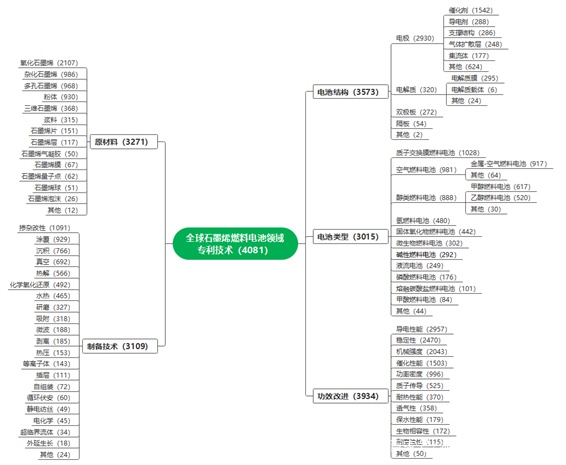 3. 燃料電池結(jié)構(gòu):主要用于燃料電池電極的催化劑層,用于電極導(dǎo)電劑、電極支撐結(jié)構(gòu)、氣體擴(kuò)散層、集流體、電解質(zhì)膜、雙極板等結(jié)構(gòu)的相關(guān)專利技術(shù)較為均衡。
