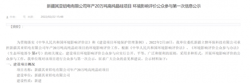項目名稱:新疆其亞鋁電有限公司年產20萬噸高純晶硅項目