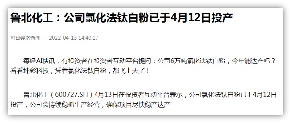 中國(guó)粉體網(wǎng)訊 小編剛剛看到一則簡(jiǎn)訊,有投資者在投資者互動(dòng)平臺(tái)向魯北化工提問:公司6萬噸氯化法鈦白粉,看看坤彩科技,憑著氯化法鈦白粉(實(shí)為鹽酸萃取法),都飛上天了!