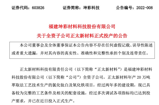 4月12日,坤彩科技發(fā)布公告,全資子公司正太新材料科技有限責(zé)任公司年產(chǎn)20萬噸萃取法工藝技術(shù)生產(chǎn)的氯化鈦白及氧化鐵項(xiàng)目,經(jīng)過兩年多的建設(shè)期,現(xiàn)已具備較為完整的工藝條件及相關(guān)的配套設(shè)施,經(jīng)過多次調(diào)試各項(xiàng)指標(biāo)均已達(dá)到投產(chǎn)要求,并已在近日投入正式生產(chǎn)。