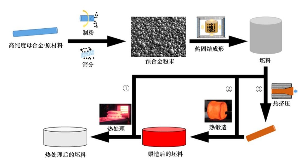 粉末高溫合金的制備主要涉及到粉末的制備、粉末熱固結成形、熱處理等工藝過程,如圖1所示。主要采用的加工路線有3種:①制粉+熱固結成型+熱處理;②制粉+熱固結成型+熱鍛造+熱處理;③制粉+熱固結成型+熱擠壓+熱鍛造+熱處理。[9]
