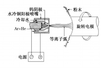 等離子旋轉電極法(PREP)是通過等離子弧熔化高速旋轉的母合金棒料端部,在離心力作用下合金液滴飛射,并在惰性氣體介質中以約104℃/s的速度,靠表面張力的作用凝固成球形的顆粒。PREP制粉工藝如圖3所示。粉末具備球形度好、表面光亮、潔凈,物理工藝性能好的特性。