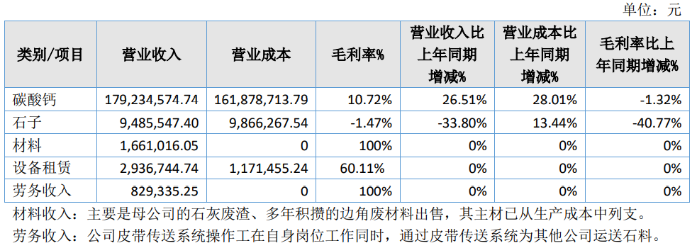 報告期內,碳酸鈣營業(yè)收入179,234,574.74元,毛利率為10.72%,營業(yè)收入比上年同期增減26.51%,毛利率比上年同期增減-1.32%;石子營業(yè)收入為9,485,547.40元,毛利率為-1.47%,營業(yè)收入比上年同期增減-33.80%,毛利率比上年同期增減-40.77%。