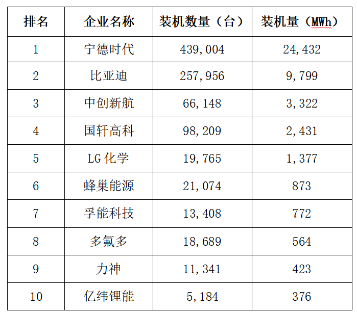 TOP10企業分別為寧德時代、比亞迪、中創新航、國軒高科、LG化學、蜂巢能源、孚能科技、多氟多、力神、億緯鋰能。