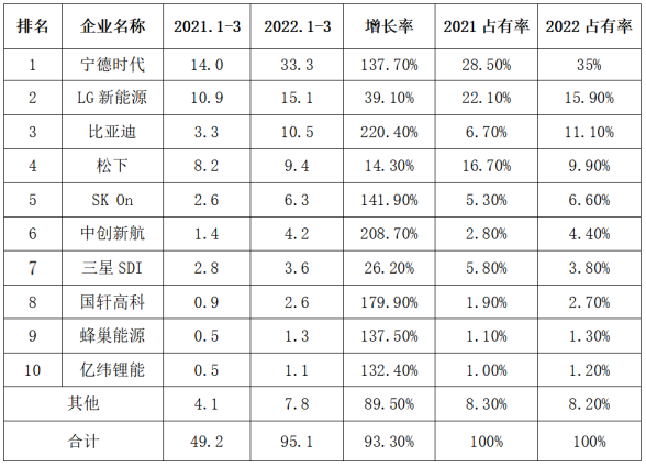 2022年一季度全球動力電池裝機量TOP10統計表(單位GWh)