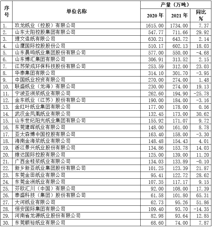 5月5日,中國造紙協會發布了“中國造紙工業2021年年度報告”,報告披露了2021年重點造紙企業產量前30名企業排名,玖龍紙業(控股)有限公司、山東太陽控股集團有限公司、理文造紙有限公司、山鷹國際控股股份有限公司和山東晨鳴紙業集團股份有限公司五家企業排名前五位,產量均超過500萬噸,26家企業產量超過100萬噸。據粉體網編輯統計,30家企業產能達到8439.91萬噸。