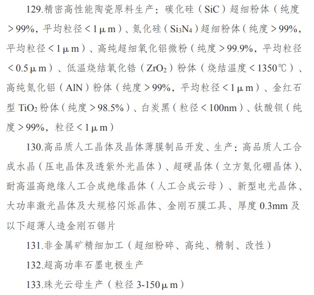 非金屬礦物制品業包括:新技術功能玻璃開發、生產,藍寶石基板研發、生產,玻璃纖維,多孔陶瓷生產,無機非金屬新材料及制品生產,精密高性能陶瓷原料生產,非金屬礦精細加工(超細粉碎、高純、精制、改性),珠光云母生產(粒徑3-150μm),非金屬礦山尾礦綜合利用的新技術開發與應用及礦山生態恢復等等。