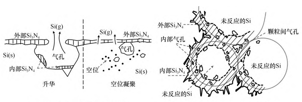 該反應合成Si3N4的路徑相對簡單,不涉及生成雜相的副反應。由于該反應為強放熱反應(在1200℃每生成1mol Si3N4可釋放約822.5kJ熱量),在實際的反應過程中Si(s)表面的溫度要遠高于反應設(shè)置的溫度,從而反應界面處的Si會液化和汽化形成Si(l)和Si(g),與此同時,Si(l)和Si(g)也都能被氮化生成Si3N4。在整個反應過程中,部分Si(g)的釋放或Si空位的集聚會在Si顆粒的內(nèi)部產(chǎn)生氣孔,同時Si顆粒的表面會形成Si3N4外殼,并且Si顆粒間會產(chǎn)生燒結(jié)熔聚,如圖1所示。