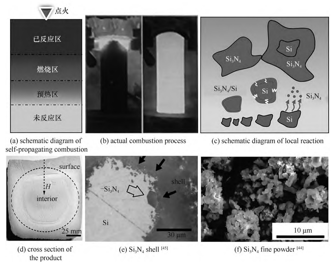 圖2 自蔓延燃燒反應合成氮化硅反應示意圖及產(chǎn)品形貌圖