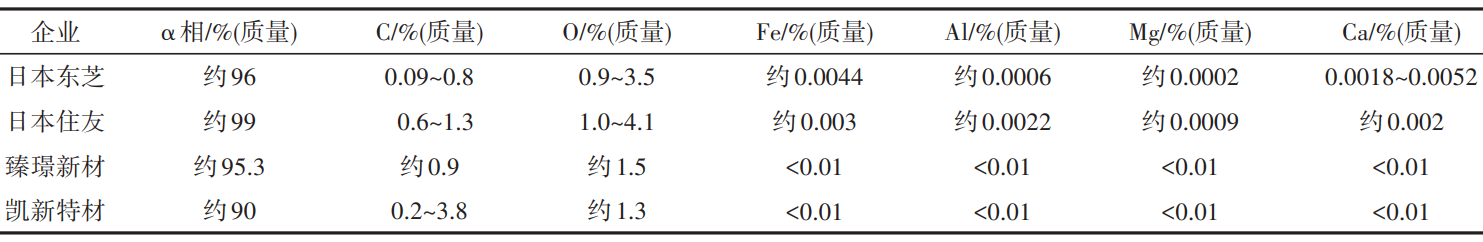 表1國內(nèi)外采用碳熱氮化SiO2生產(chǎn)Si3N4粉體質(zhì)量