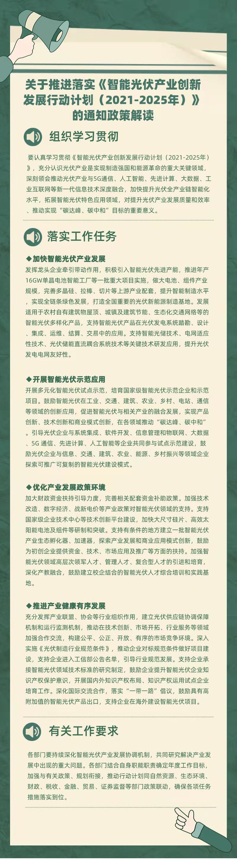 中國(guó)粉體網(wǎng)訊 6月13日,山西省工業(yè)和信息化廳印發(fā)文件,稱將從加快智能光伏產(chǎn)業(yè)發(fā)展、開展只能光伏示范應(yīng)用、優(yōu)化產(chǎn)業(yè)發(fā)展政策環(huán)境、推進(jìn)產(chǎn)業(yè)健康有序發(fā)展四方面推進(jìn)落實(shí)《智能光伏產(chǎn)業(yè)創(chuàng)新發(fā)展行動(dòng)計(jì)劃(2021-2025年)》。