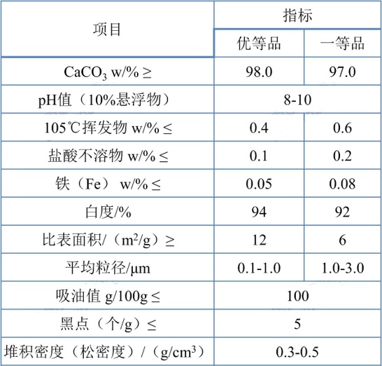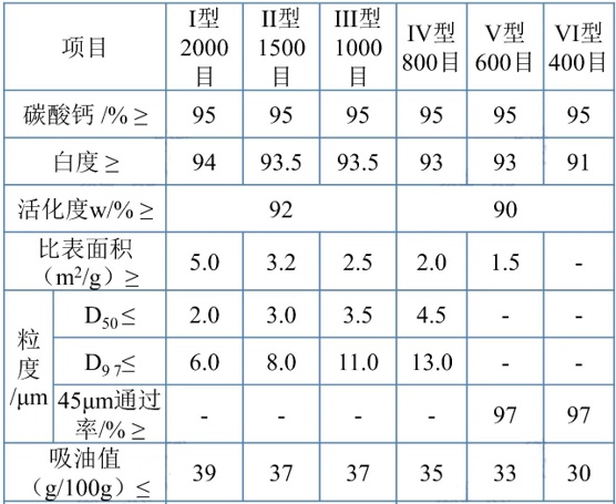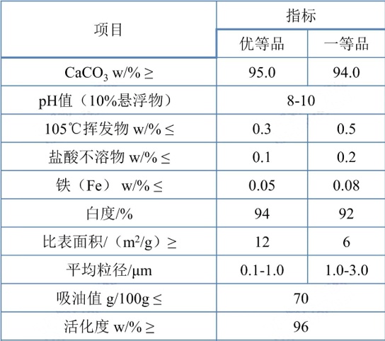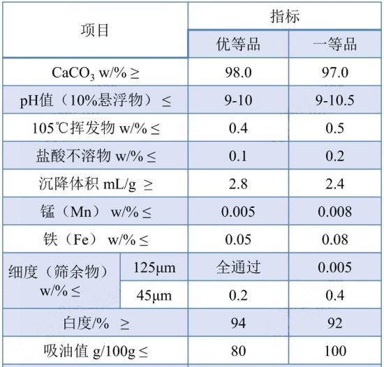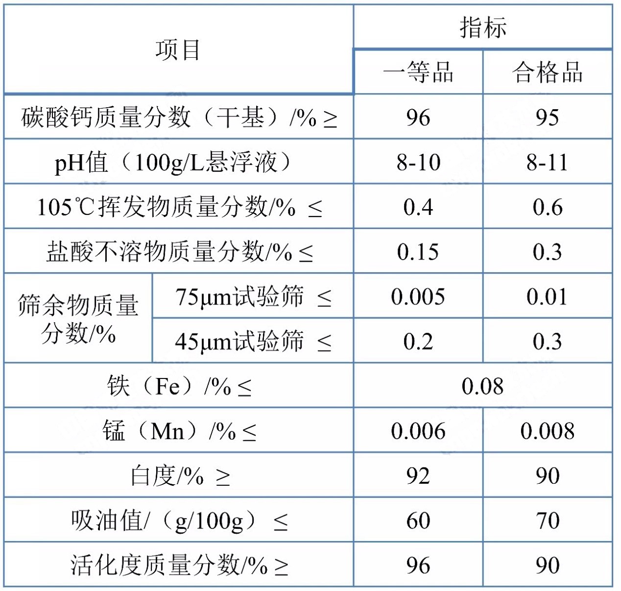 表Ⅰ《HG/T2226-2010普通工業(yè)沉淀碳酸鈣》——橡膠、塑料用普通輕質(zhì)碳酸鈣指標(biāo)要求