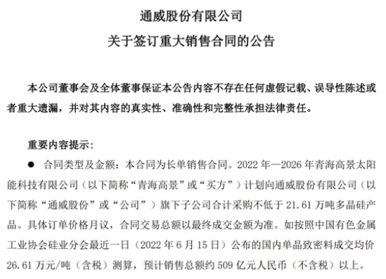 6月17日,硅料巨頭通威股份(600438)發布公告稱,4家子公司近日與青海高景太陽能(000591)科技有限公司簽訂不低于21.61萬噸的多晶硅產品銷售合同,預計銷售總額超過509億元。