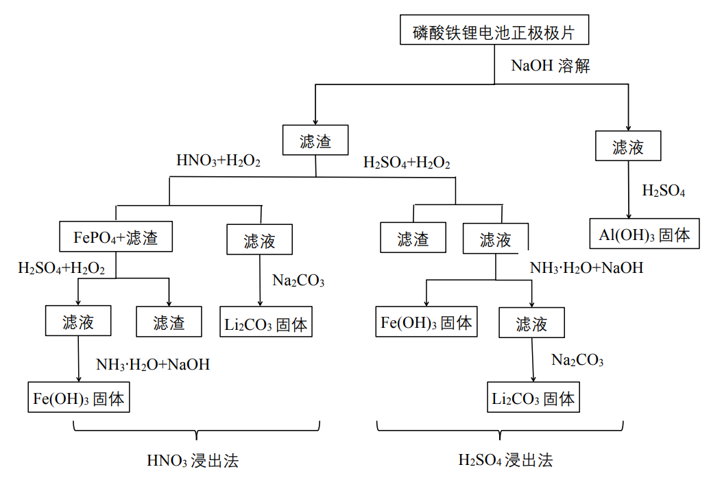 方法一為用硫酸與雙氧水溶解濾渣,使LiFePO4以Fe2(SO4)3和Li2SO4形式進入溶液,與碳雜質分離后的濾液用NaOH和氨水調節pH值,先使鐵以Fe(OH)3沉淀,余液用飽和Na2CO3溶液沉淀獲得Li2CO3;