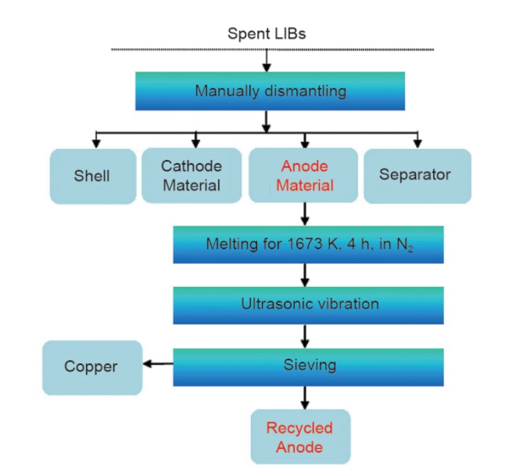 研究人員通過簡單的高溫熔煉和篩分工藝步驟,從廢舊鋰電池當中成功地再生了石墨。在1673K氮氣氣氛下煅燒4小時,集流體銅箔變成了球形顆粒并從石墨中分離出來,隨后通過超聲振動和篩分可得到再生石墨,經該工藝回收的石墨純度可達99.5%,符合電池級石墨材料標準(上圖)。