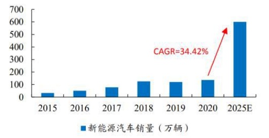 根據中國汽車工程學會編制的《節能與新能源技術路線圖2.0》,到2025年我國新能源汽車在新車銷量中滲透率將達到20%。根據中汽協預測,2025年我國汽車銷量有望達3000萬輛,以20%的滲透率計算,屆時我國新能源汽車銷量有望達600萬輛。而到2035年,新能源汽車更將成為主流,占總銷量50%。