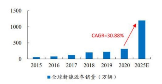 據EV Sales數據,2020年全球新能源乘用車銷量達312.48萬輛,即使在全球汽車市場萎縮的情況下,新能源乘用車仍保持了41.40%的高速增長。據EVTank預測,至2025年,全球新能源汽車銷量有望達到1200萬輛。