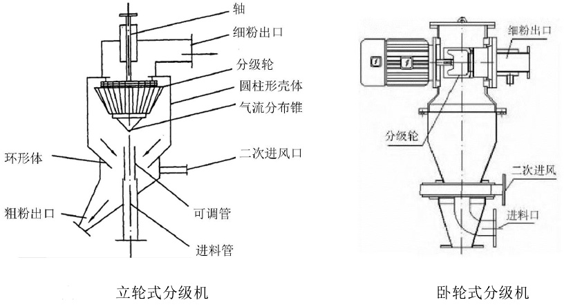 目前工業生產中應用較廣泛的分級設備為渦輪空氣分級機,根據分級輪的安裝形式不同可分為立輪式和臥輪式。