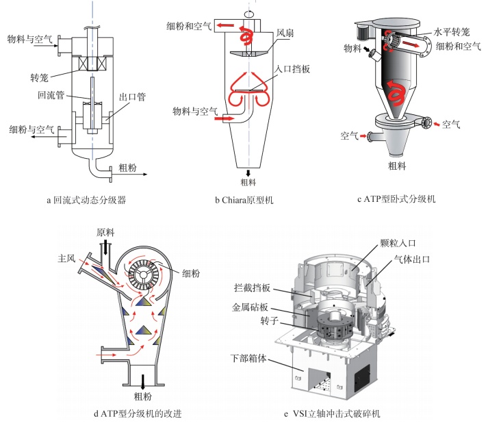 除了在原有轉子分級機基礎上進行結構尺寸結構和操作參數優化外,也有學者通過添加內構件、改變氣流進口和出口方向等開發了新型動態分級機。