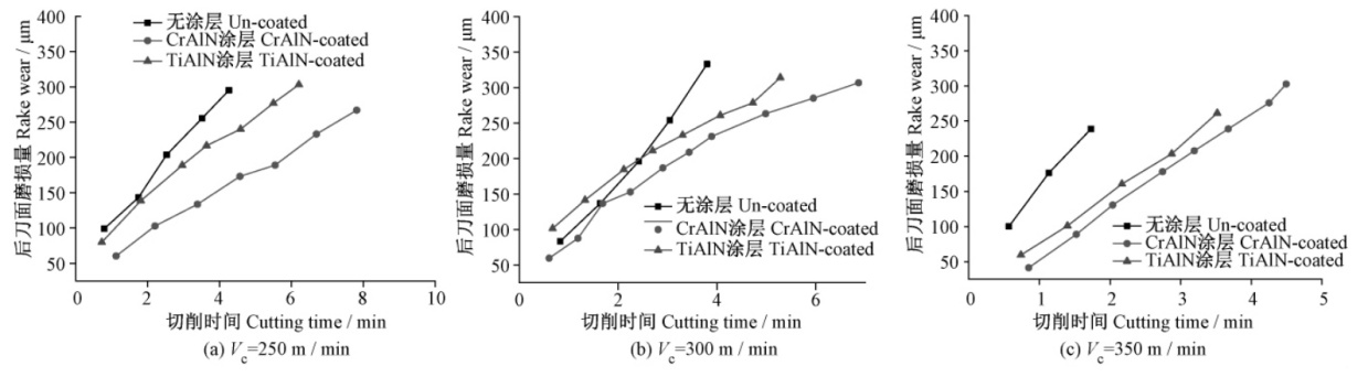 實驗刀具不同切削速度下的磨損曲線(來源:阮銘業等,《氮硅涂層陶瓷刀具切削鑄鐵磨損機理研究》)