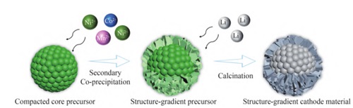 梯度結構是由核殼結構衍生而來。傳統核殼結構材料中,核(富Ni)與殼(富Mn)分別起到提供比容量和穩定材料結構的作用,但內外成分含量跨度較大,長期循環后核殼間便出現斷層,從而破壞Li+運輸通道,造成嚴重容量衰減。而濃度梯度結構則是在此基礎上使核殼成份由內向外呈梯度變化,改善了由于內核和外殼成分差異大而產生的結構斷裂,合成示意圖如圖所示。