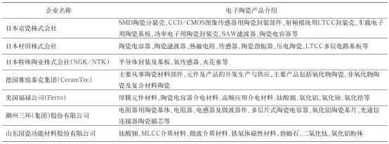我國電子陶瓷產業起步較晚,相比于美國和日本等經濟發達國家尚存在較大差距,對于電子陶瓷的研發仍任重道遠。國內外部分重點電子陶瓷企業及重點產品如下表所示。