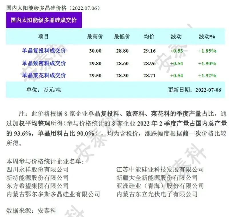 中國有色金屬工業協會硅業分會7月6日公布的太陽能級多晶硅最新價格數據顯示:單晶復投料在28.8-30.0萬元/噸,平均29.16萬元/噸,周環比漲幅1.85%;單晶致密料主流成交價在28.6-29.8萬元/噸,平均28.96萬元/噸,周環比漲幅1.90%;單晶菜花料主流成交價在28.3-29.5萬元/噸,平均28.71萬元/噸,周環比漲幅1.92%。