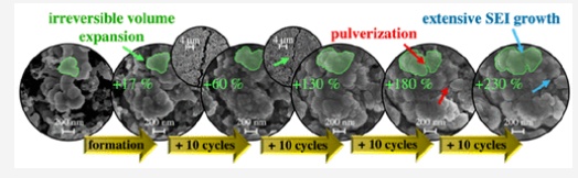 在這項(xiàng)研究中,研究人員利用準(zhǔn)原位(QUIS)SEM和EDX,在充放電循環(huán)中探討純硅納米顆粒復(fù)合電極的降解過(guò)程,包括粉碎、不可逆體積變化和表面降解產(chǎn)物(floor degradation merchandise)。