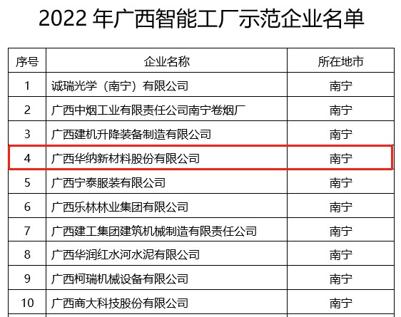 7月12日廣西壯族自治區工業和信息化廳公布了“2022年廣西智能工廠示范企業和數字化車間企業名單”,廣西華納新材料股份有限公司榜上有名,被認定為廣西智能工廠示范企業。