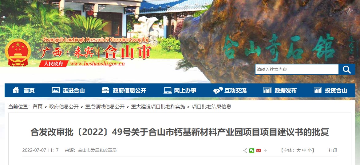 近日,合山市鈣基新材料產業園項目獲得當地發展和改革局批準,同意實施建設。據悉,該項目位于合山市產業轉型工業園區,估算總投資約2億元,建設廠房12座(總面積為64327.36m2)及一座辦公樓和配套基礎設施。