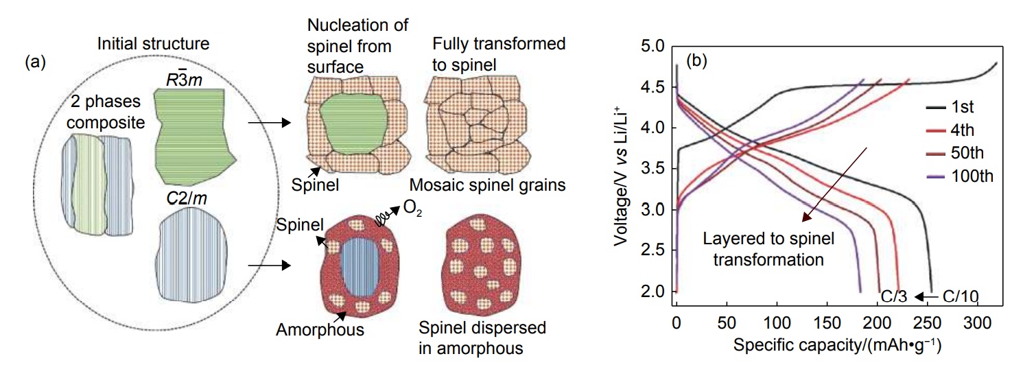 富鋰錳基正極材料(a)結構演變示意圖;(b)充放電曲線(圖源:南文爭等,《富鋰錳基正極材料研究進展》)