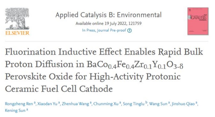中國粉體網訊 近日,北京理工大學孫克寧教授團隊在質子陶瓷燃料電池氧電極材料設計方面取得新進展,相關研究成果以“Fluorination Inductive Effect Enables Rapid Bulk Proton Diffusion in BaCo0.4Fe0.4Zr0.1Y0.1O3-δ Perovskite Oxide for High-Activity Protonic Ceramic Fuel Cell Cathode”為題發表在國際期刊Applied Catalysis B: Environmental上(IF="24.319),北京理工大學為唯一通訊單位,化學與化工學院孫克寧教授和王振華教授為文章共同通訊作者,博士后任戎征為該論文的第一作者。