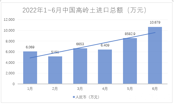 據(jù)海關(guān)總署數(shù)據(jù),2022年1~6月,我國(guó)進(jìn)料高嶺土約28萬(wàn)噸,總額約4.4億元。
