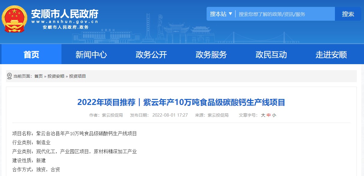 項目選址于紫云工業園區貓營工業園內,建設內容為年產10萬噸食品級碳酸鈣生產線1條,建設生產加工廠房,其它辦公、倉庫等生活設施,總建筑面積5000m2。資源儲備方面,紫云縣方解石礦山20余處,探明儲量243萬m3,正在開發利用資源量135萬m3,剩余108萬m3,方解石資源廣泛分布。