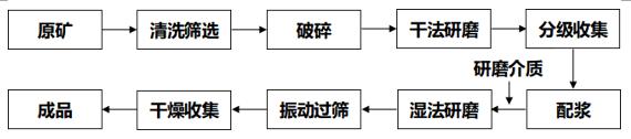 將原礦經洗選后兩段破碎至400目左右,配制成一定濃度的漿液,加入研磨助劑,給入立式研磨機,以氧化鋯珠作為研磨介質,通過調整磨機各項參數控制出料細度,物料經磨細后以漿料形式排出,經干燥除塵后收集而成。