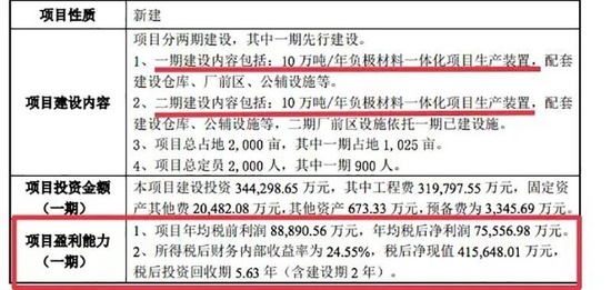中元股份公告顯示,此次中元股份擬定增募投的年產20萬噸高性能鋰離子電池負極材料一體化建設項目(一期10萬噸/年)總投資約34.43億元,擬使用募集資金約7.72億元。盈利能力方面,年均稅前利潤約8.89億元,年均稅后凈利潤約7.56億元;所得稅后財務內部收益率為24.55%,稅后凈現值41.56億元,稅后投資回收期5.63年(含建設期2年)。