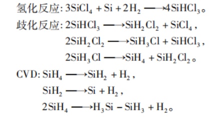硅烷法制備多晶硅主要技術(shù)是將冶金級(jí)硅粉與四氯化硅和氫氣轉(zhuǎn)化為三氯氫硅,再將三氯氫硅通過(guò)精餾工序提純及歧化反應(yīng),生成電子級(jí)硅烷氣送至多晶硅反應(yīng)器,通過(guò)化學(xué)氣相沉積(CVD)生長(zhǎng)成多晶態(tài)硅棒。